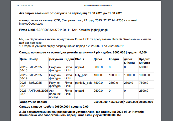 Акт звірки взаєморозрахунків допоможе вам швидко перевірити, які документи вже оплачені, які залишаються неоплаченими, а які — частково оплачені. Звірка в BitFaktura базуватиметься саме на статусах документів, тож ви одразу побачите реальний стан розрахунків із клієнтами та постачальниками.